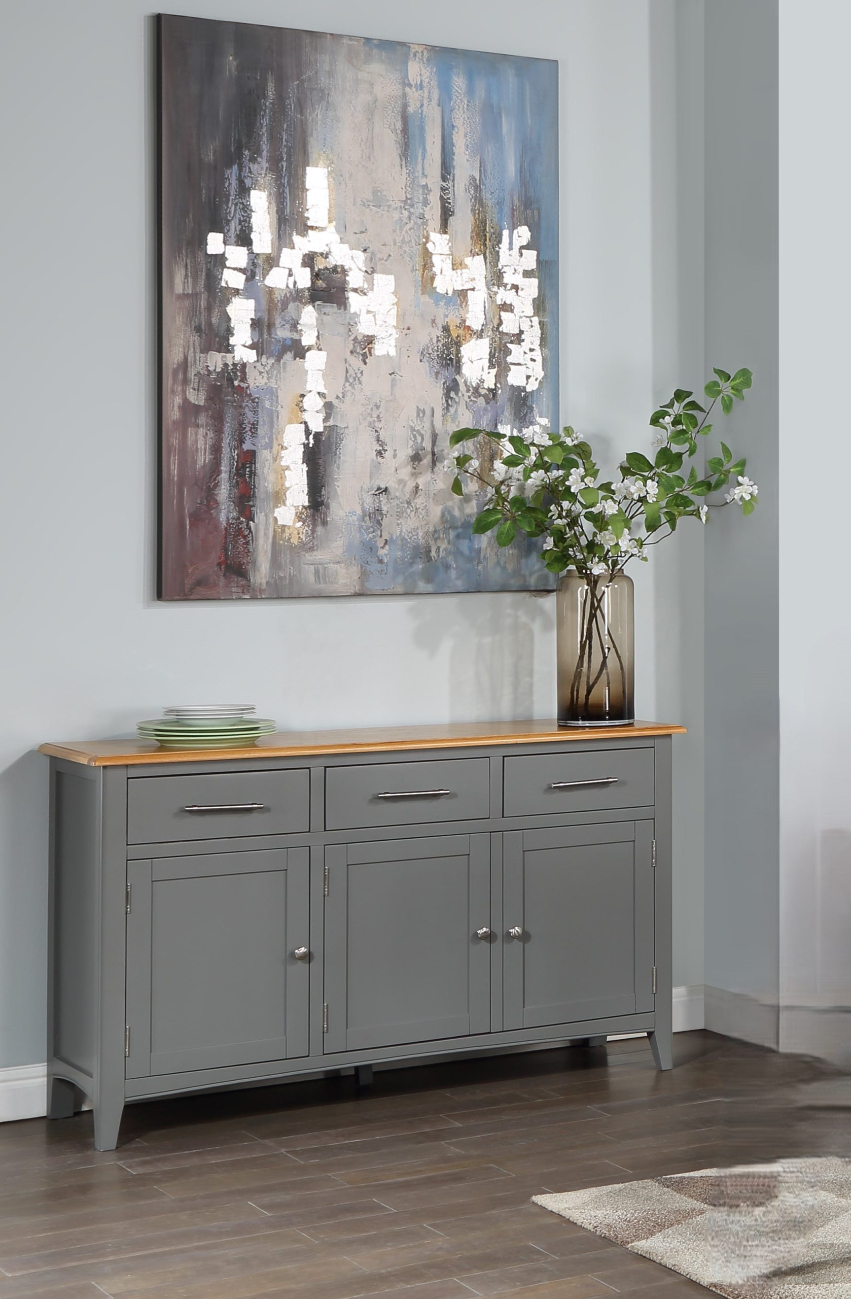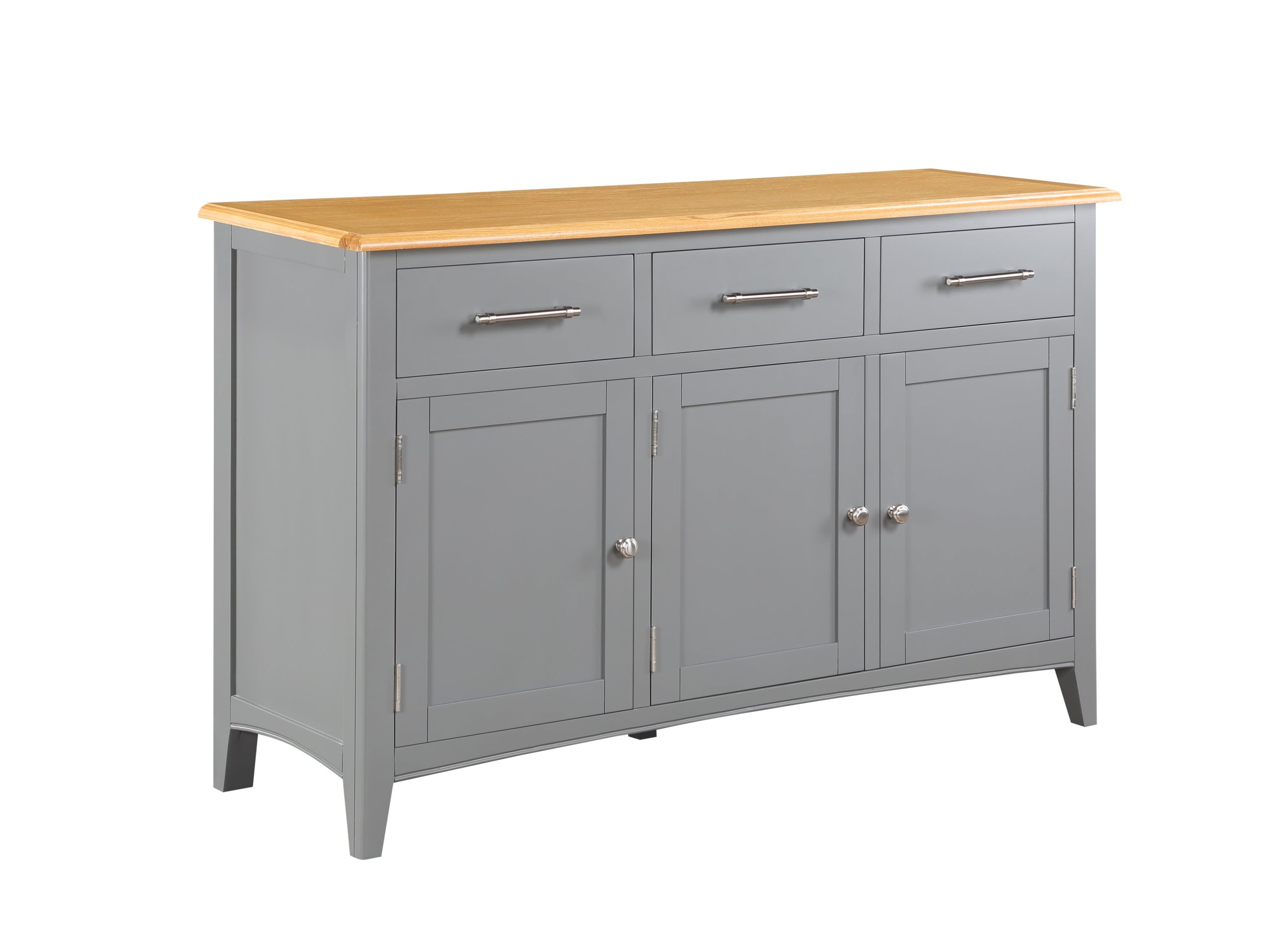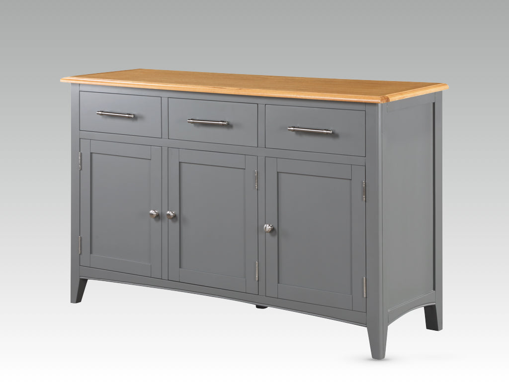 Experience modern design and practicality with Rossmore’s 3 Door Sideboard. Crafted from solid oak and veneer, this sleek slate grey piece boasts ample storage and elegant details, including curved edges, tapered legs, and chrome handles. The mid-oak top adds a beautiful contrast, making it a stunning addition to any living or dining space.