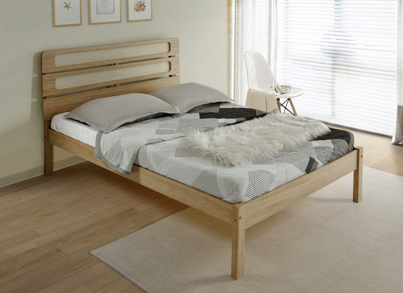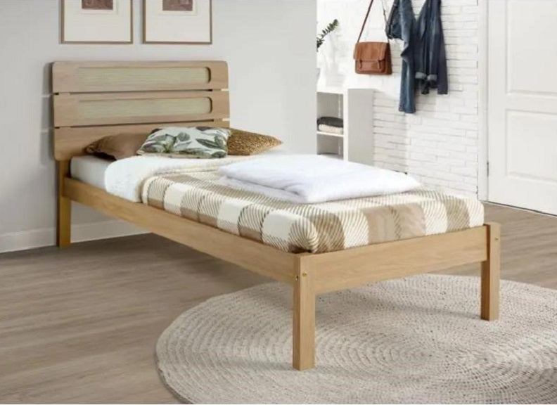 SANTANA BED – in a warm light oak finish with slatted base & slatted ‘rattan’ styled headboard. Perfect bed for any décor style and is ideal suited to growing children.