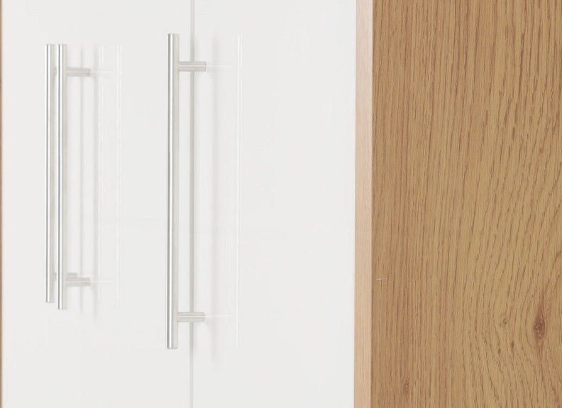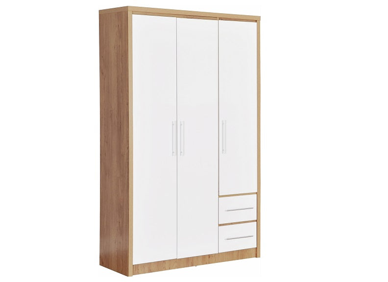 Seville White Three Door Two Drawer Wardrobe in a two colour finish and composed of MDF board with coloured gloss finished veneers, metal drawer runners & handles.