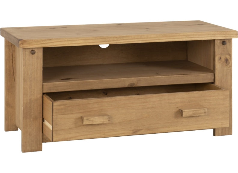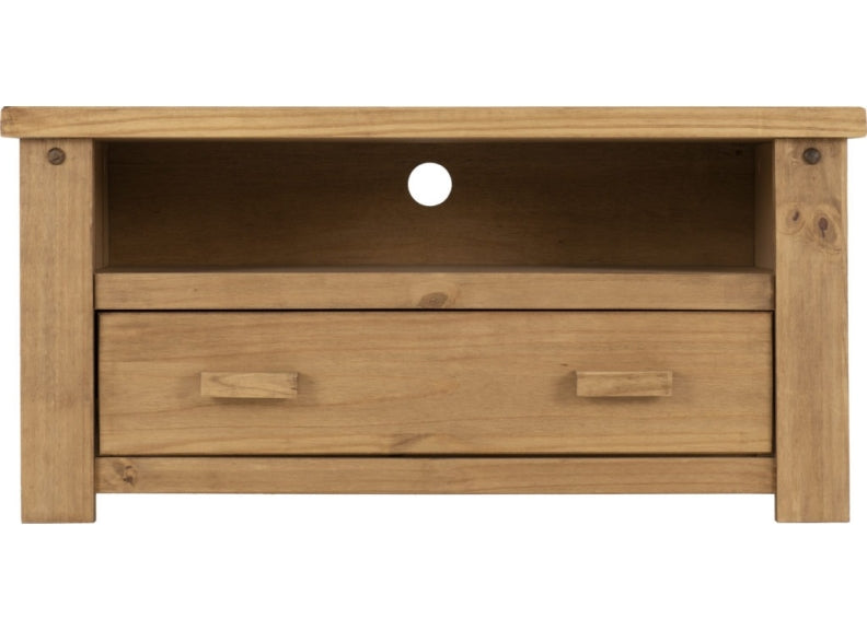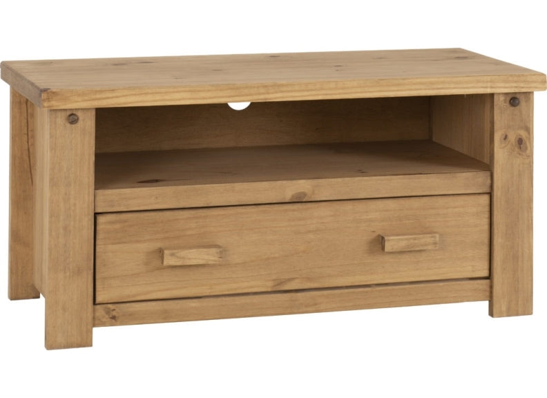 TORTILLA PINE RECTANGULAR FLAT SCREEN TV STAND-with a distressed waxed pine frame with single drawer in a chunky traditional Mexican style and like our Corona Collections at a value for money price.