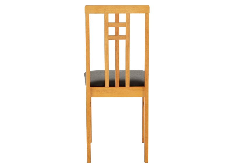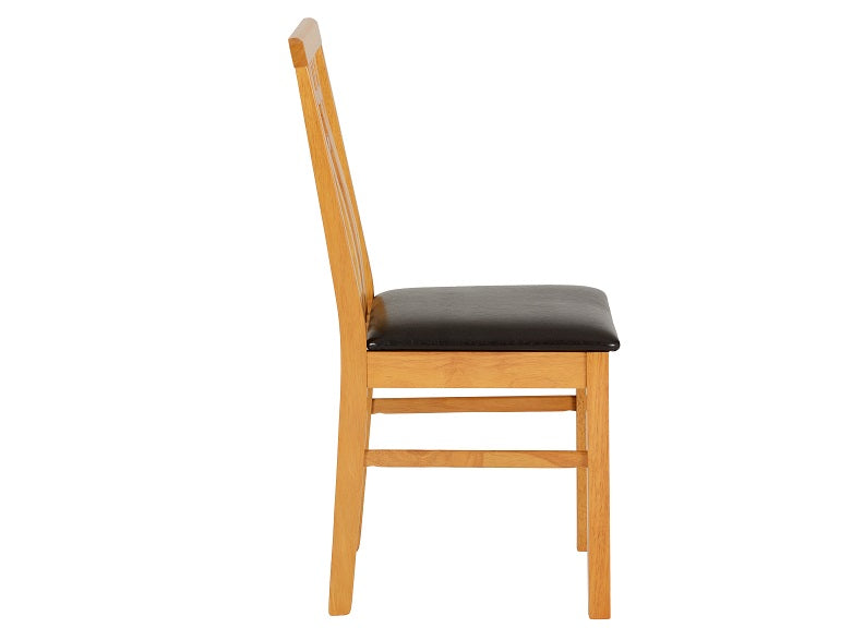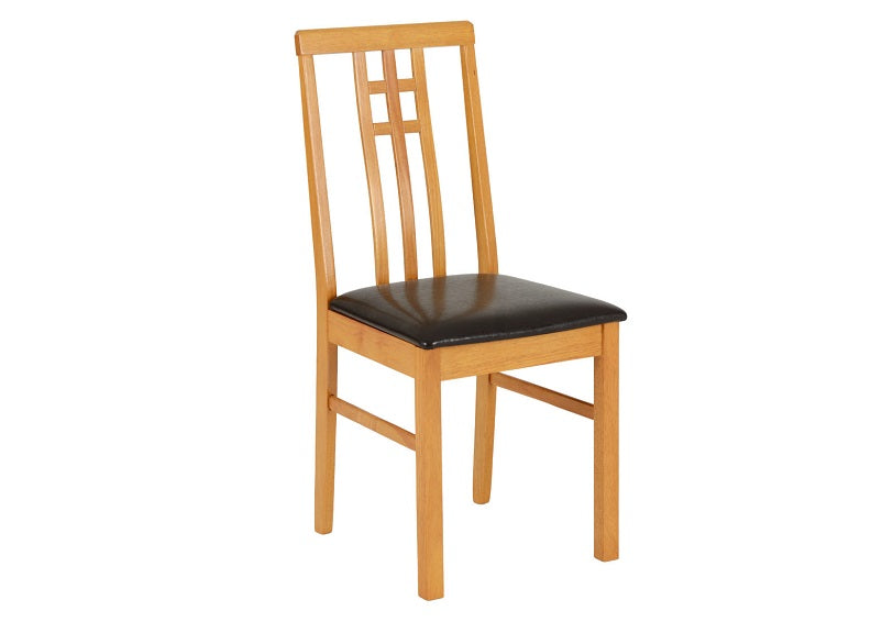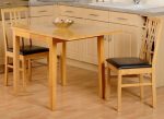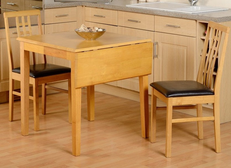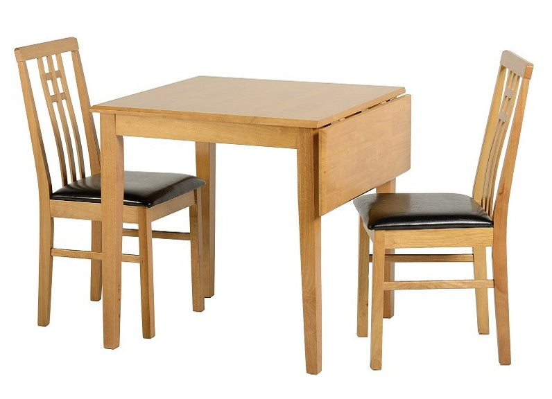 Vienna Compact Dropleaf Dining Table With Two Vertically Slated Dining Chairs – a light oak & particle board veneer dining set with faux leather seat pad chairs.