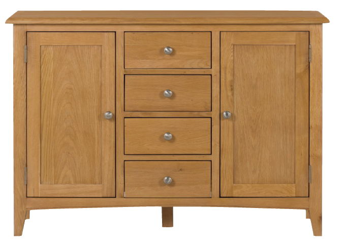 Enhance storage with Kilkenny Oak 4 Drawer Sideboard. Made with solid oak and select oak veneers for durability and sophistication. Natural oak finish highlights wood grain and chic chrome handles add a touch of elegance. Perfect for any interior.