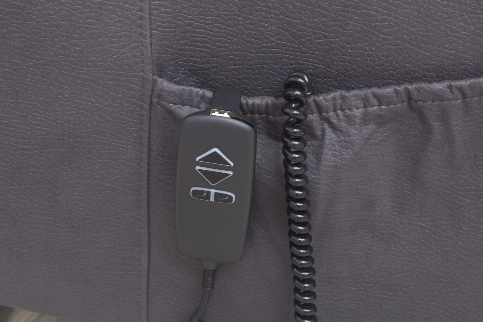 - Dark grey microfibre fabric upholstery for a contemporary look.